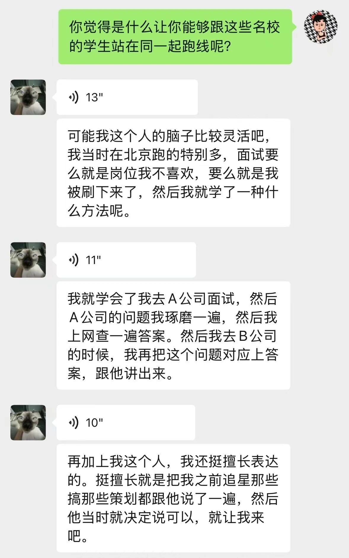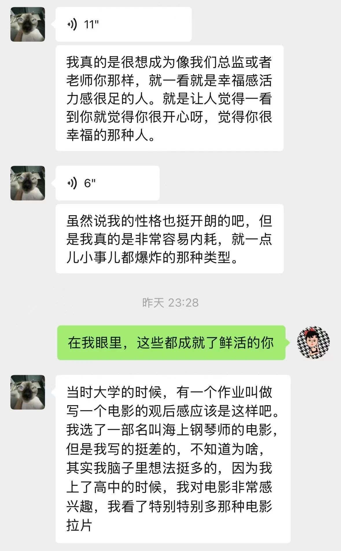 当她兴高采烈地向我分享她参与策划的文案,我一边感到骄傲,一边又很后悔——为什么当时没有与她产生更多的交集?为什么没有给她提供更系统深入的指导?她在微信中提到自己求职的优势是共情力和表达力强、脑子灵活,而我看到更多的是勇敢,敢于走出去,把自己的爱好变成优势,走向更大的舞台。