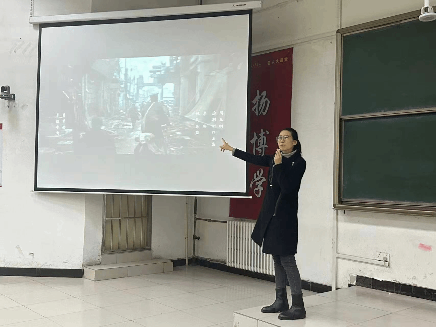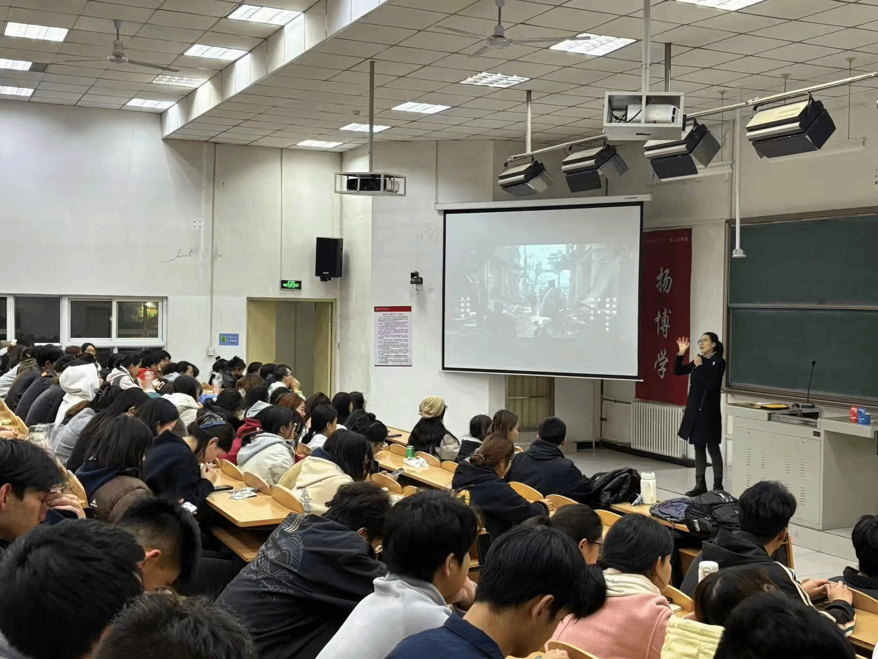随后,贾老师延伸至动画片“完全想象性空间”,提出“即便极致虚构的空间,依然能传递真实现实意义”的观点。她总结,无论是追求真实的纪录片空间、还原历史基础上融入主观表达的故事片空间,还是完全虚构的动画片空间,本质都是导演表达思想、实现观众共情的载体。整场讲座中,贾老师以互动式教学引导思考,同学们专注投入、积极回应,现场兼具学术严谨与活泼氛围。