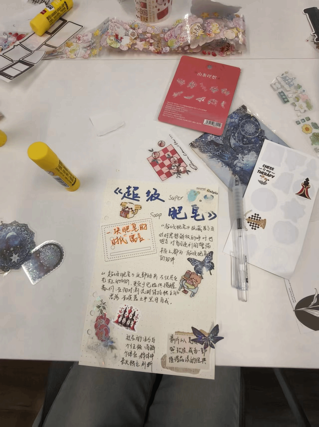 互动结束后,同学们依托活动提供的手帐素材,将观影影评、内心感悟融入手帐创作,以文字与创意排版定格本次观影的思考与收获。