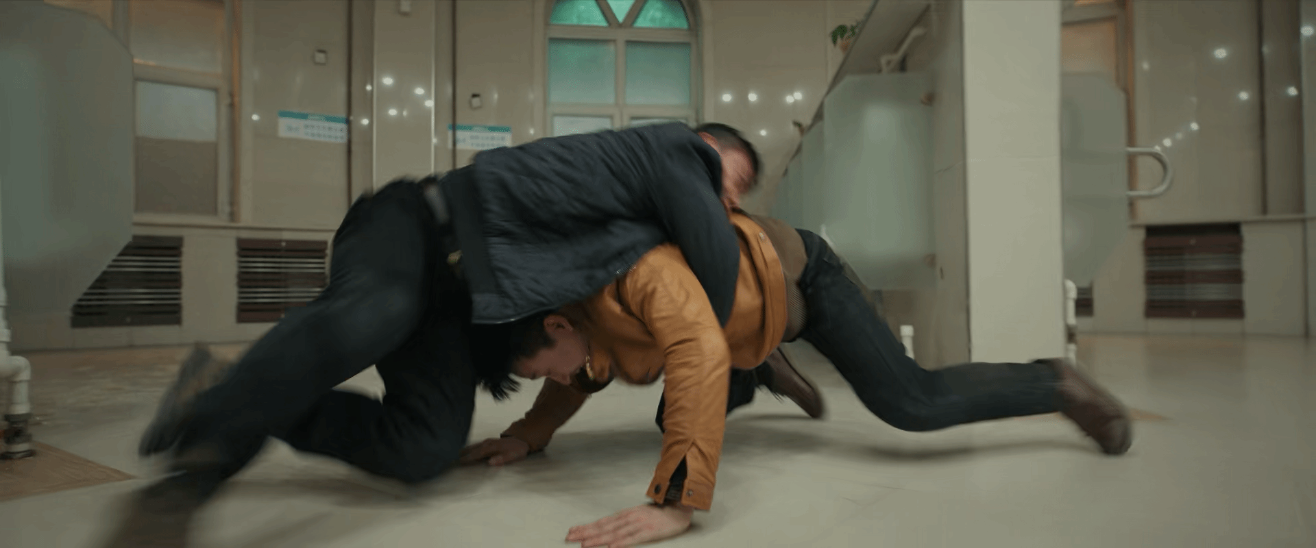在动作呈现层面,主人公李红旗的身体形象构成了这一系列的核心特征。他的格斗方式既不同于武侠电影中灵动飘逸的身体,也并非单纯展示高超武艺的表演型动作。尽管具备良好的格斗能力,这一身体仍然会疲乏、受伤,甚至显得笨重而迟滞。影片中的打斗多为贴身格斗:抱摔、锁喉、扭打构成主要动作元素,而腾空翻滚等高度表演化动作被明显弱化。在影像风格上,影片偏好使用长镜头与手持摄影来呈现动作的连续性,使观众能够感受到体力消耗与身体失衡,从而强化一种接近现实打斗的观看体验。