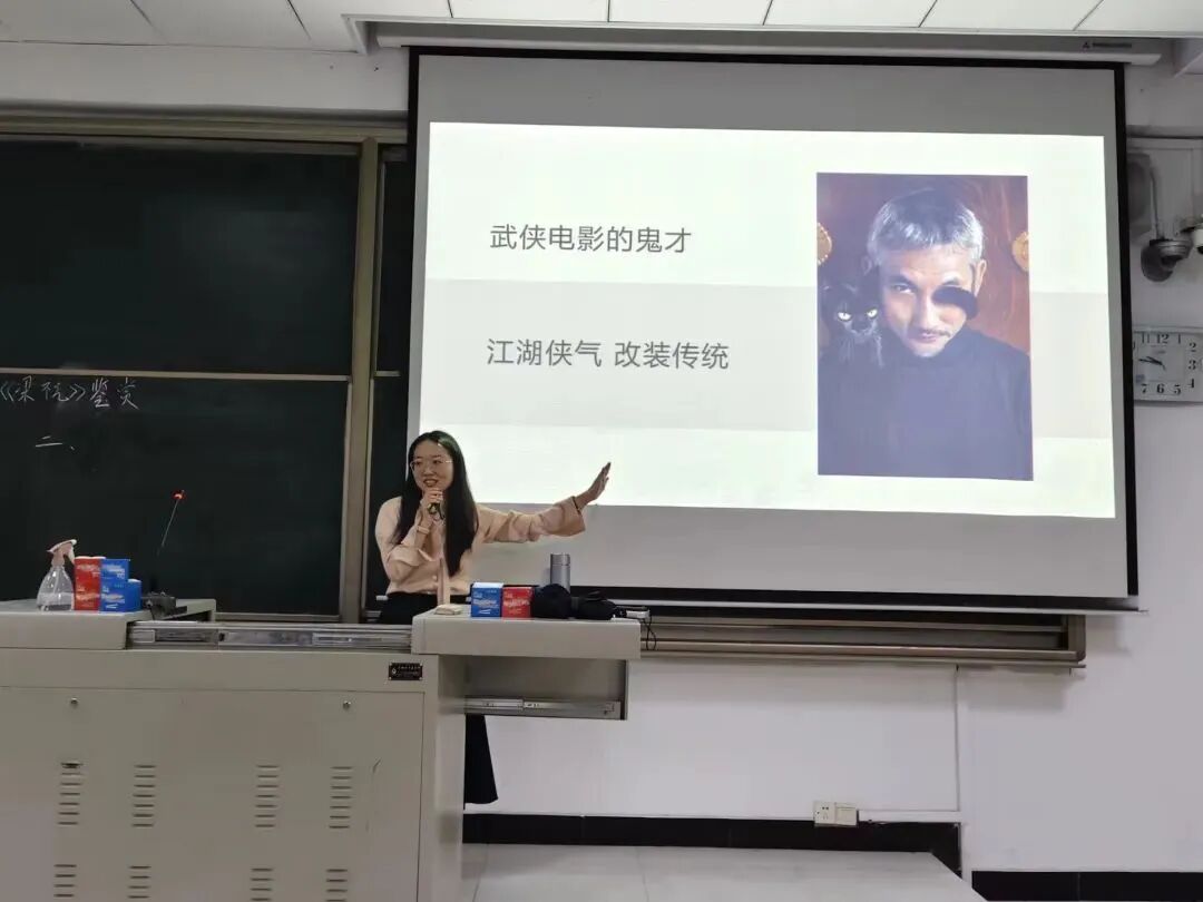课程在《梁祝》悠扬的旋律中拉开序幕。杨老师以徐克执导的经典影片为切入点,从导演风格、人物塑造和视听语言三个维度展开分析。她特别指出,影片中“蝴蝶”意象的运用不仅象征自由与新生,更突破了传统女性角色的桎梏;而“古琴”作为情感载体,与剧情发展紧密交织。杨老师以影片片段为例,生动展示了徐克如何通过光影、色彩与构图,将古典美学与现代电影语言完美融合。