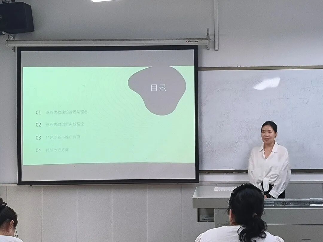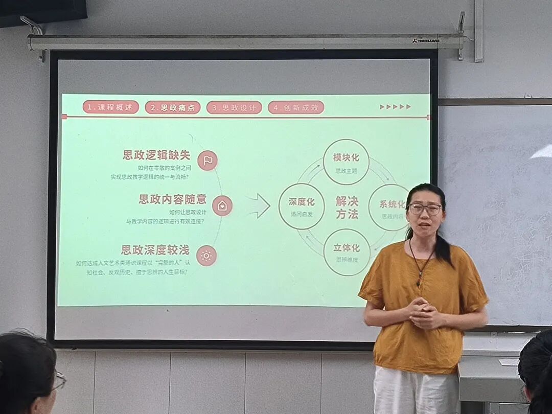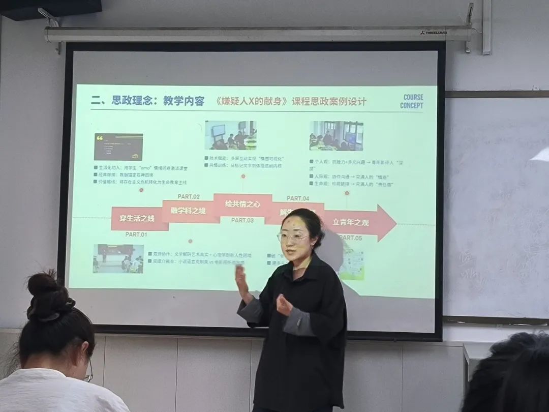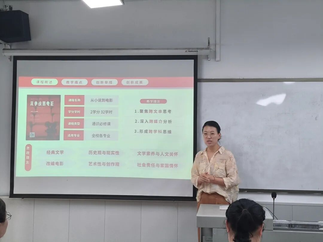 闫莹老师:在课程思政创新报告中,围绕面向大一新生的“从小说到电影”课程,从建设背景与理念、教学中课堂参与度低等问题、内容重构与沉浸式体验等思政实践,以及AI技术融入等改进方向展开,突出思政元素与教学的融合。汇报环节结束后,马克思主义学院高培月老师与通识教学部杨晓玲老师从不同维度进行专业点评,为课程思政建设提供了新思路。