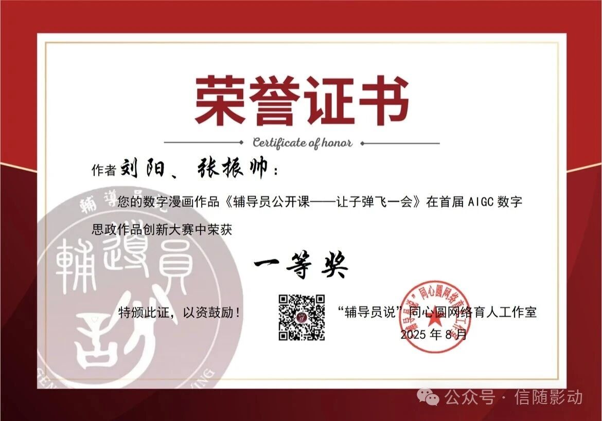 近日,由“辅导员说”同心圆网络育人工作室主办的“首届AIGC数字思政作品创新大赛”评选结果正式揭晓。经过全国30余所高校的激烈竞争,由我校淬炼商学院·国际商学院辅导员刘阳与电影评论中心张振帅老师共同创作的微视频作品《辅导员公开课——〈让子弹飞一会〉》荣获微视频类一等奖!