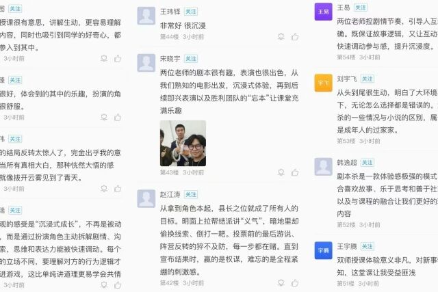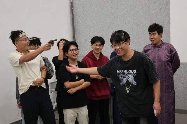 当鹅城的“硝烟”渐渐散去,但思想的激荡却远未停止。课程结尾,两位老师以一句“子弹穿透荒诞,理想主义注定孤勇”作为收束,点燃全场思考。机电(专升本)2501的王佳瑞感慨:“我演的是‘土匪三当家’,表面上粗鲁,但在推翻暴政的那一刻,我突然懂了什么叫‘站着挣钱’。”机电(专升本)2502的韩鑫哲说:“原来理论可以这么‘活’!从剧本杀到电影拉片,我不仅学会了叙事结构,更感受到理想主义的分量。”